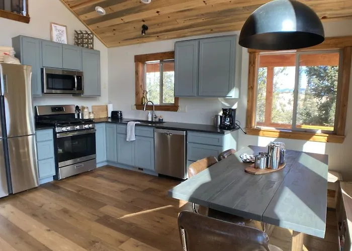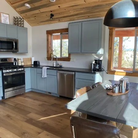 Cozinha totalmente equipada está completa com microondas, chaleira elétrica e refrigerador, apresentada na Secluded Modern Cabin On 10 Acres Tarryall Creek.